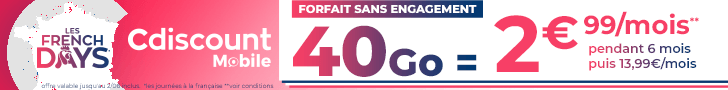 Avec Cdiscount Mobile, vous profitez d'un petit prix de 2,99€ par mois durant les six premiers mois sur le forfait mobile 40 Go. Au bout des six mois passés, cette remise sur le forfait évoluera au prix de 13,99€ par mois. Néanmoins, l'abonnement est sans engagement donc rien ne vous empêche de résilier celui-ci avant l'augmentation du tarif. Ce forfait chez Cdiscount Mobile inclut les appels, SMS et MMS en ilimité en France métropolitaine. Ce forfait pas cher contient une enveloppe de 40 Go de données mobiles en 4G à utiliser en France métropolitaine. Vous disposez de 3 Go utilisables en Union Européenne et dans 38 destinations: 30 destinations en Europe (27 pays de l'Union Européenne + L'Islande, le Liechtenstein et la Norvège) et 8 destinations en Outre Mer.
