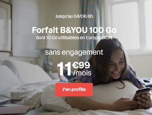 B&You a prolongé son forfait mobile 100 Go à 11,99€ par mois à vie jusqu'au 4 Juin 2020. Le forfait pas cher vous permet de profiter de 100 Go sur le réseau 4G Bouygues Telecom et pour un petit prix ! En vous abonnant à cette formule, vous bénéficierez des appels, SMS et MMS illimités depuis la France, l'Europe et les Départements d'Outre Mer. Vous pourrez ainsi communiquer avec vos proches autant qu'il vous plaît sans se soucier de la facture mobile par la suite.