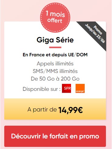 Super promo chez Free mobile ! Jusqu’au 23 juin 2020, l’opérateur vous propose sa Série Free 50 Go pour seulement 10,99 €/mois pendant 1 an. Après cette période, vous passerez automatiquement au forfait Free à 19,99 €/mois (ou 15,99 € pour les abonnés Freebox). Néanmoins, l’offre étant sans engagement, vous pourrez résilier à tout moment si les services ne vous conviennent pas ou si vous trouvez moins cher ailleurs.