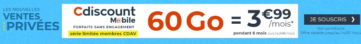 Pour les membres de la carte Cdiscount à Volonté (CDAV) c'est encore plus de promo pour moins cher grâce à une nouvelle vente privée d'avant SOLDES d'été ! En effet, le prix du forfait 60Go décrit ci-dessus est de 3,99€ pendant 6 mois avant de repasser à un prix définitif de 14,99€. Concernant l'enveloppe mise à disposition pour voyager, le bonus sera cette fois de 5Go par mois.