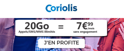 Coriolis Telecom propose le forfait 20Go à 7,99€ qui comprend les appels, SMS et MMS en illimité en France, depuis l'UE ainsi que les DOM. Vous bénéficierez d'une belle enveloppe de 60 Go depuis la France métropolitaine.