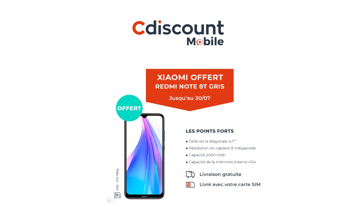Si vous souhaitez profiter d'un volume internet généreux pour un forfait à prix raisonnable en plus d'un smartphone gratuit, ce nouveau forfait Cdiscount vous conviendra parfaitement. Pour seulement 15,99€/mois, vous aurez accès à vie à un forfait offrant 50Go de Data. Vous pouvez y souscrire jusqu'au 30 juillet 2020 et profitez avec d'un Xiaomi Redmi Note 8T offert d'une valeur de 169€.