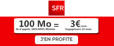 L'opérateur SFR propose lui aussi un forfait 100Mo à petit prix avec option de blocage. Le forfait vous fait bénéficier de 100 Mo à utiliser non seulement en France, mais aussi en Europe et dans les DOM. d Afin que vous ne soyez pas surfacturés, les données internet seront automatiquement bloquées dès lors que le seuil autorisé aura été consommé.