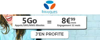 Le dernier forfait avec possibilité de bloquer est celui de l'opérateur Bouygues Télécom. Celui-ci propose une enveloppe un peu plus grande avec 5Go à disposition tous les mois. Le prix affiché est de 8,99€ par mois durant un engagement d'un an et changera à 19,99€ par la suite. Vous pourrez utiliser la totalité de vos gigas en France, en Europe et dans les DOM.