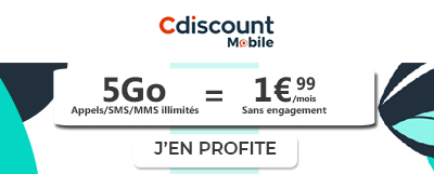 Le forfait en promo de Cdiscount Mobile est à seulement 1,99€ pendant 6 mois ! Bonne nouvelle, l'abonnement comprend 5Go en France et 1Go à utiliser à l'étranger (l'Europe et les DOM). Après les six mois passés, le prix de la mensualité passera à 9 euros par mois.