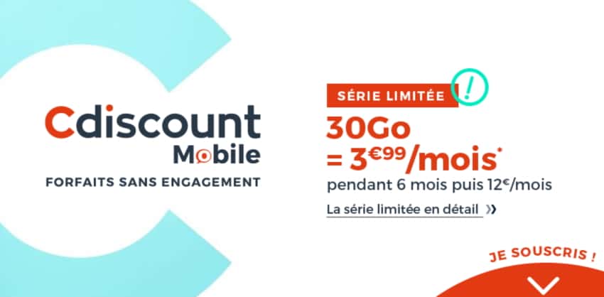 Cdiscount Mobile propose un forfait en série limitée jusqu'au 14 septembre 2020 seulement. Pendant les 6 premiers mois votre forfait mobile ne vous coûtera que 2.99€/mois. Ensuite, il passera automatiquement à 12.99€/mois. Vous pourrez toutefois choisir de ne profiter que du prix en promo et de résilier votre abonnement avant l'augmentation car c'est un forfait sans engagement.