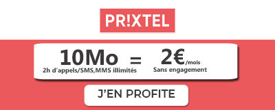 L'opérateur Prixtel propose a son tour un forfait à 2 euros par mois sans engagement. L'avantage avec cet abonnement est que vous pourrez choisir une enveloppe de data internet adaptée à vos besoins. Vous disposerez de 10Mo par mois en  France, en Europe et les DOM. Vous pourrez également passer 2 heures d'appels en France, depuis l'Europe et les DOM vers la France. Les SMS et MMS sont illimités en France, depuis l'Europe et les DOM.