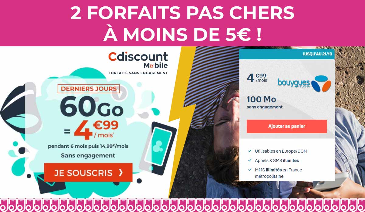 Cdiscount Mobile propose de son côté un forfait mobile assez différent. Son prix de 4,99€/mois est valable seulement les 6 premiers mois de l'abonnement, ensuite vous serez facturé 14,99€/mois. Vous pouvez néanmoins décider de résilier avant l'augmentation car c'est aussi un forfait sans engagement.
