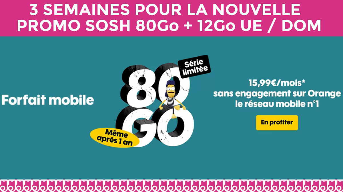 Besoin d'un forfait mobile avec max data sur le réseau Orange ? Bonne nouvelle avec le forfait mobile Sosh 80 Go à 15,99 € par mois valable depuis ce matin et jusqu'au 16 Novembre prochain à 9H. Cette superbe série limitée offre les appels et SMS/MMS à volonté en France. Depuis l'Union Européenne et l’Outre-mer, vous pourrez également échanger sans limites via les appels et les sms vers ces destinations, ainsi que vers l’Hexagone. Lors de vos voyages dans ces zones, votre enveloppe Internet passera elle à 12 Go.