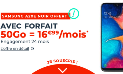 Le téléphone qui accompagne ce forfait illimité est le Samsung Galaxy A20E d'une valeur de 189€. Il est doté d'un écran de 5,8 pouces, d'un double appareil photo de 13Mpx et 5Mpx. Il permet de stocker jusqu'à 35Go et sa batterie offre une autonomie de 3000mAh.