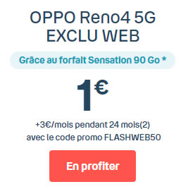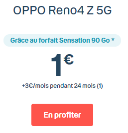 Évalué à 123 € dans le cadre de l’abonnement Sensation 90 Go avec Avantages Smartphone, l'OPPO Reno4 vous reviendra donc à seulement 73 € grâce au tarif réduit, si vous optez pour le paiement comptant. Mais, vous pouvez aussi choisir de régler en 24 mois. Avec la réduction de 50 €, vous ne débourserez par conséquent que 1 € + 3 € par mois pendant deux ans.
