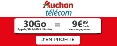 C'est le forfait le moins cher du moment et vous pouvez en profiter grâce à Auchan Télécom. En effet, ce forfait pas cher ne vous coûtera que 2,99€/mois pendant 6 mois puis 12,99€/mois. Il est valables sans engagement et vous pouvez y souscrire jusqu'au 9 novembre 2020 à minuit.