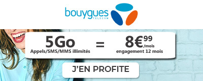 Vous préférez le réseau de Bouygues Telecom ? Pas de problème ! L’opérateur vous propose son forfait Sensation 5 Go pour uniquement 8,99 € par mois la première année. Les mensualités passeront ensuite à 19,99 €.