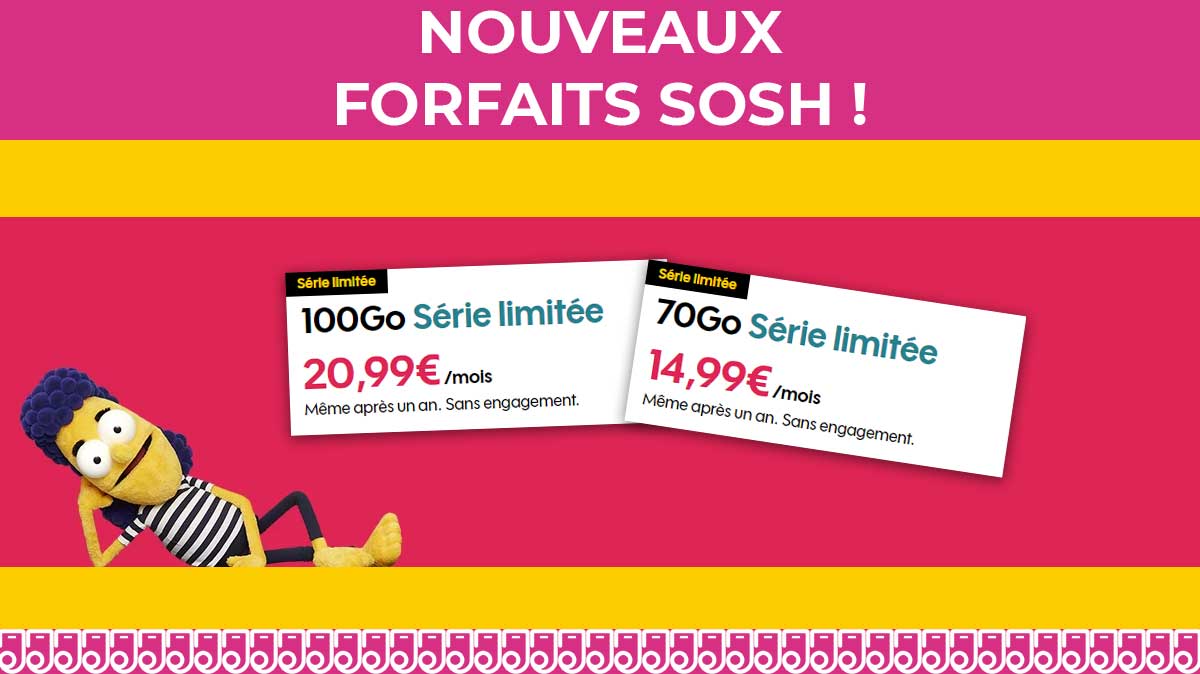 Depuis ce matin et jusqu'au 14 décembre à 9h, vous pouvez souscrire à l'une des deux nouvelles promotions Sosh. En effet, l'opérateur a décidé de lancer deux nouveaux forfaits mobiles à prix réduits. Vous pouvez choisir entre le forfait 70Go à 14,99€/mois et le forfait 100Go à 20,99€/mois. Vous pourrez en profiter sans condition de durée, ces prix n'augmenteront pas, même après un an.