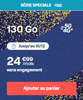 Une proposition au tarif mensuel de 24,99€ offrant 130Go de data pour vraiment vous faire plaisir avec votre smartphone 5G. Il ne faut aucun doute que tous les assoiffés de vidéos ou de jeux en réseaux, dans les zones couvertes en 5G seront absolument ravis !