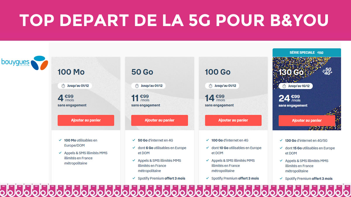 - Le forfait 100Mo est à 4.99€ par mois disponible sans condition de durée jusqu’au 01/12