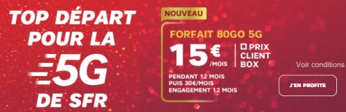 En ce moment, SFR commercialise un forfait 80 Go 5G à 25 € par mois (15 € par mois pour les clients box) la première année. Soumis à un engagement d’un an, ce dernier inclut les communications illimitées via appels, SMS et MMS en Métropole, mais aussi depuis l’Europe, l’Outre-mer, la Suisse et Andorre.