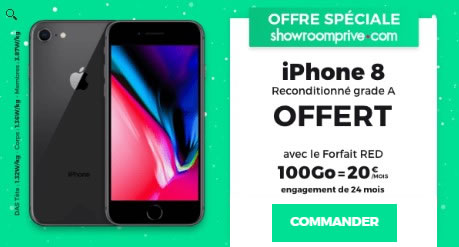 RED by SFR renouvelle sa récente opération "d'Avant Noël" menée sur Showroomprivé.com vous offrant un iPhone 8 accompagné d'un forfait 100Go facturé à 20€/mois et soumis à un engagement de 24 mois.