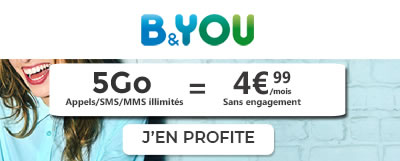 Avec le forfait B&You facturé 4.99€ par mois, vous profitez tous les mois de votre enveloppe Internet de 5Go que ce soit en France, et Europe ou dans les DOM. Au-delà des 5Go autorisés chaque mois, le prix du Mo au tarif en vigueur est de 0,01€/Mo en France métropolitaine. Sachez que vous pouvez activer gratuitement et à tout moment l'option vitesse réduite depuis votre espace client afin d’éviter le hors forfait. Pour les communications, vous pourrez appeler et échanger des SMS et MMS sans compter en France mais aussi lors de vos voyages en Europe et DOM.