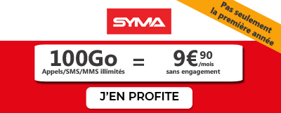 Syma Mobile qui dispose d'un accord pour utiliser le réseau numéro 1 en France, Orange, commercialise cinq forfaits sans engagement dont une offre à 9.90€ qui nous intéresse aujourd'hui. En effet, pour ce tarif attractif, cet opérateur virtuel met à disposition 100Go de 4G en France dont 6Go sont utilisables lors de vos séjours en Europe et DOM. En plus de cette jolie enveloppe Web, ce forfait pas cher intègre les communications illimitées en France et depuis l'Europe et les DOM. Avec cette offre, vous pourrez également communiquer sans compter vers l'international. La promotion est valable sans condition de durée, autrement dit, le prix de l'abonnement n'évoluera pas au bout d'un an.