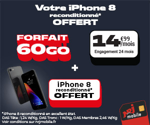 Vous cherchez un forfait mobile en promo mais aussi un smartphone pour la rentrée ? Ne passez pas à côté de l'offre NRJ Mobile "forfait mobile et iPhone offert". L'opérateur vous propose jusqu'au 5 septembre inclus, de recevoir gratuitement un iPhone 8 reconditionné pour toute souscription au forfait 60Go à 14,99€/mois avec un engagement de 24 mois.
