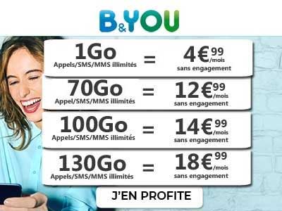 - Le forfait B&You 24/24 1Go en France, en Europe et DOM à seulement 4.99€ par mois