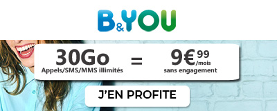 Repoussées jusqu'au 7 Novembre 2021 inclus, vous pouvez encore profiter d’un superbe forfait B&You à seulement 9,99€ par mois ! Cette offre est sans engagement et sans condition de durée. Ce premier forfait pas cher au catalogue promotionnel de l'opérateur Bouygues vous offrira 30Go de data disponibles en 4G que ce soit en France, en Europe ou dans les DOM. En craquant pour ce forfait à prix réduit, vous accéderez aux appels et aux envois sans compter de vos SMS et MMS en France Métropolitaine.