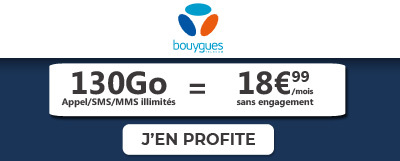 Chez Bouygues Telecom, une série spéciale B&You 130 Go est disponible sans engagement pour 18,99 € mensuels. Valable jusqu’au 21 novembre 2021, cette offre mobile 4G comprend une enveloppe data de 15 Go pour les voyages dans les DOM (Guadeloupe, Guyane française, Réunion, Martinique, Mayotte) et certains COM (Saint-Barthélemy, Saint-Martin, Saint-Pierre-et-Miquelon).