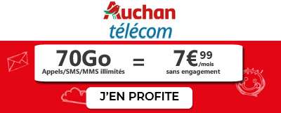 On commence par le plus petit forfait et le moins cher de cette sélection proposée par Auchan Télécom. Un forfait à 5Go, pour un prix mini de 3€99 par mois ! L'offre est valable pendant 12 mois et passe ensuite à 7€99 par mois. Pour ce prix, vous aurez droit aux appels en illimité ainsi que les SMS et MMS à volonté. Sans engagement, il vous sera possible de résilier cet abonnement à tout moment. Profitez de cette offre en série limitée (jusqu'au 14/12) efficace et très accessible !