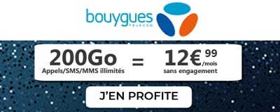 Vous êtes un plus grand consommateur de données mobiles et vous craignez qu'une enveloppe internet de 100Go ne suffise pas ? Qu'à cela ne tienne ! Profitez alors du forfait comprenant 200Go de data, de quoi profiter pleinement de toutes vos applications et d'internet. Dans le cadre des séries spéciales B&YOU de cette fin d'année 2021, ce forfait maxi data de 200Go est proposé au prix réduit de 12€99 par mois !