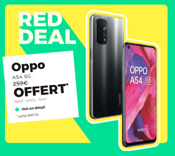 RED by SFR n'a décidément pas fini de vous surprendre : c'est le retour du RED DEAL ! Cette superbe offre vous permet d'obtenir gratuitement un nouveau smartphone : le OPPO A54 5G. Et oui, grâce à cette formule proposée par RED, vous allez recevoir ce smartphone neuf avec 64Go ayant une valeur de 259€. Pour ce faire, il vous faut suffit de souscrire au forfait 100Go affiché au prix de 15€ par mois (au lieu de 20€), avec une durée d'engagement de 24 mois. Dépêchez-vous cette offre est valable jusqu'au 07 février.
