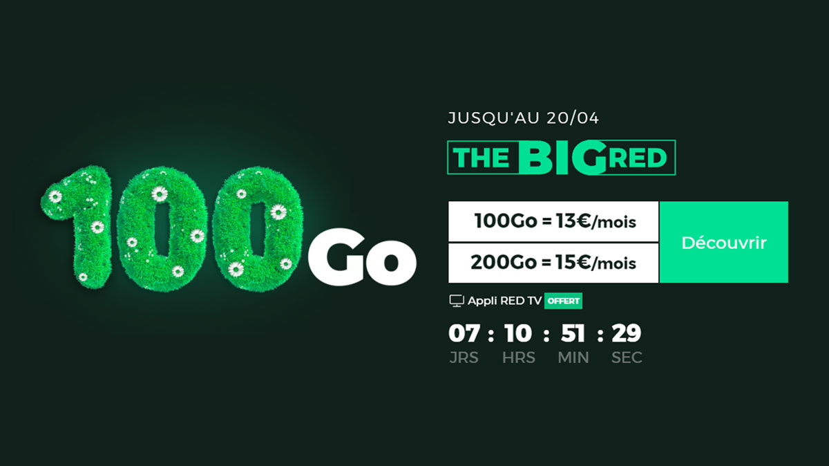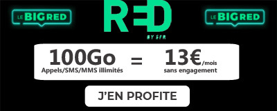 Rendez-vous chez RED BY SFR pour découvrir le BIG RED ! Vous cherchez un forfait de téléphone comportant 100 Go de données mobiles au meilleur prix ? Nous avons trouvé pour vous une bonne affaire qui ne vous laissera pas indifférent ! Cette promo est à saisir chez RED by SFR ! Vous aurez donc 100 Go de data sur le réseau de SFR à utiliser dans l'Hexagone. Vous pourrez bénéficier de 14 Go de data depuis les Outre-Mer et depuis toute l'UE. Côté communication, vous aurez les appels, SMS et MMS illimités en France métropolitaine, depuis les DOM et depuis l'Union européenne, cette offre mobile sans engagement va en plus en convaincre plus d'un. Vous aurez également dans votre offre la RED TV inclus.