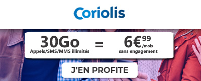 Avec son forfait de téléphone 30 Go, Coriolis n'a décidément pas fini de vous surprendre ! Jusqu'au 19 avril, l'abonnement Coriolis est commercialisé au tarif mini de 6,99 €/mois pendant 12 mois, après quoi vous repasserez sur le prix standard de 14,99 €/mois.