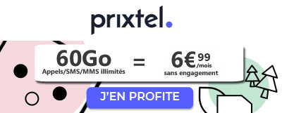 Si vous êtes à la recherche d'un forfait mobile 60 Go, voilà une promo très intéressante ! Où retrouver cette promotion ? Chez Prixtel bien sûr ! Jusqu'au 3 mai, l'abonnement Prixtel est proposé au très bon tarif de 6,99 €/mois pendant 12 mois, après quoi vous repasserez sur le prix standard de 12,99 €/mois.