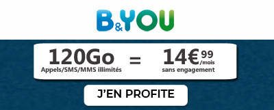 B&You vous propose une offre mobile parfaite pour les gros consommateurs de données mobiles, puisqu'on vous propose pas moins de 120 Go ! Les services proposés par le forfait B&You incluent 120 Go de data sur le réseau de Bouygues en France métropolitaine. Si cet abonnement de téléphone illimité vous intéresse, vous aurez en plus tout le loisir de naviguer sur le net à hauteur de 20 Go depuis les départements d'Outre-mer et depuis l'Union européenne. Par ailleurs, si ce forfait de téléphone sans engagement vous intéresse, vous pourrez bénéficier d'appels, SMS et MMS illimités en France métropolitaine, depuis l'Outre-Mer et depuis l'UE.