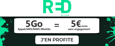 Prolongation d'un bon plan RED by SFR ce matin qui devrait ravir les petits budgets. Jusqu'au 12 Juin prochain, un premier forfait RED by SFR 5 Go est accessible au super tarif de 5 € par mois. Et l’ensemble est sans engagement de durée. En plus des 5 Go de data utilisables en France métropolitaine, RED by SFR ajoute 6 Go depuis l'Outre-Mer et depuis toute l'Union européenne. En sélectionnant ce forfait pas cher, vous profiterez des appels, SMS et MMS à volonté dans l'Hexagone, depuis les départements d'Outre-mer et depuis la zone Europe.