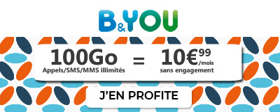 Si vous êtes à l'affût d'un forfait de téléphone 100 Go, voilà un super bon plan qui ne vous laissera pas indifférent. Où retrouver cette promotion ? Chez B&You bien sûr ! L'offre B&You est disponible au très bon prix de 10,99 €/mois au lieu de 17,99 €/mois jusqu'au 6 juillet. Le tout sans douche froide au bout de quelques mois, puisque cette bonne affaire est valable sans condition de durée !
