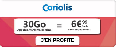 Vous êtes à l'affût d'un forfait de téléphone 30 Go sur le réseau SFR ? Nous vous avons dégoté une promo qui ne vous laissera pas de marbre ! Où retrouver ce bon plan ? Chez Coriolis bien sûr ! Jusqu'à ce soir, mardi 20/09/2022, l'abonnement Coriolis vous est proposé au super prix de 6,99 €/mois pendant 12 mois, après quoi vous repasserez sur un tarif fixe de 9,99 €/mois.