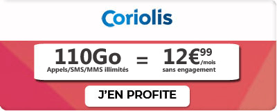 Pour le plus grand plaisir des gros consommateurs de données mobiles, Coriolis met en promo son abonnement de téléphone maxi data avec 110 Go. Le forfait Coriolis vous est offert sans condition de durée au très bon prix de 12,99 €/mois.