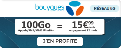 Jusqu'au 6 novembre, Bouygues Telecom vous permet de bénéficier d'un forfait 5G pas cher et complet. Il s'agit d'un forfait mobile 100Go de son catalogue d'offre Sensation disponible avec engagement. Vous pouvez y souscrire pour seulement 15,99€/mois pendant un an puis 30,99€/mois avec un engagement de douze mois. Sachez que si vous êtes abonnés à une Bbox, vous pouvez profiter de ce forfait 5G à seulement 10,99€/mois la première année puis 25,99€/mois avec un engagement de douze mois.