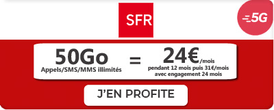 Jusqu’au 5 décembre 2022, SFR propose un forfait 50 Go 5G en série limitée avec un téléphone à prix préférentiel parmi une large sélection de modèles Apple, Samsung, Xiaomi ou autres. Soumis à deux ans d’engagement, l’abonnement coûte 24 € par mois la première année et 31 € mensuels par la suite. Une remise de 5 € est toutefois appliquée sur toutes les factures des clients qui possèdent aussi une box SFR.
