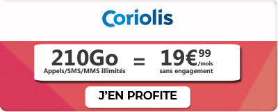 Chez Coriolis Telecom, le forfait 5G Brio Liberté 210 Go est affiché à 19,99 € par mois sans engagement. Cette offre mobile colossale comprend :