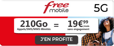 Disponible pour 19,99 € mensuels sans engagement, le forfait Free 5G comprend 210 Go de data en France métropolitaine et 25 Go d’Internet depuis plus de 70 autres territoires. Il inclut aussi :
