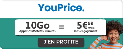La formule le One de YouPrice est l’une des meilleures offres de forfait pas cher du marché. Ce forfait pas cher est en promo à 5,99€ la première année, avant de passer à 9,99€.