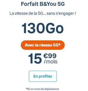 Bonne nouvelle ! Si vous cherchez un forfait mobile avantageux avec un max de data, Bouygues Telecom propose actuellement une offre spéciale pour son forfait B&You 130Go 5G. Cet abonnement est proposé à seulement 15,99€/mois. Ce forfait mobile sans engagement comprend les Appels et SMS/MMS illimités en France métropolitaine et 130 Go de Data sur le réseau 5G de Bouygues Telecom, dont 30 Go utilisable depuis la zone UE.