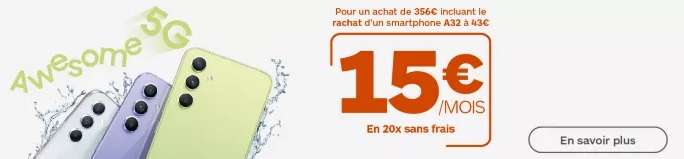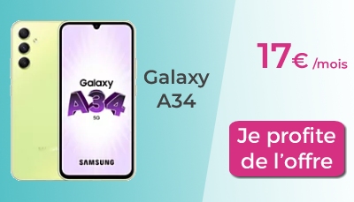 En ce moment Boulanger propose d’acquérir l’un de ces deux mobiles avec une offre super intéressante : vous pouvez payer jusqu’en 20 fois et cela, sans frais ! Après un apport obligatoire de 71 € le premier mois, il ne vous reste plus qu'à payer un peu moins de 18 € par mois pour un Galaxy A34 et un peu moins de 23 € pour un Galaxy A34 5G. Et il est encore possible de réduire ce prix en revendant votre ancien smartphone à Boulanger. Par exemple si vous possédez un Samsung Galaxy A32, Boulanger vous le rachète pour 43 €, vous n'auriez donc plus à payer que 356 € en 20 fois, en comptant l'apport de 71 € le premier mois cela ferait donc 15 € par mois seulement pour un Galaxy A34 5G !