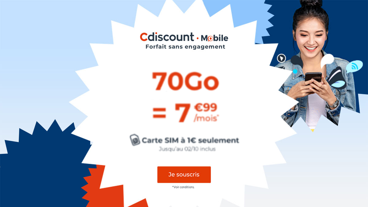 Comme vous l’avez lu plus haut, ce forfait promotionnel de Cdiscount Mobile est proposé à seulement 7,99€/mois, sans condition de durée. En d’autres termes, vous n’avez pas à craindre que ce prix passe à 8, 9 ou 10 € au bout de quelques mois ou même d’un an. Ce tarif est figé, vous permettant ainsi de bien organiser votre budget et de faire de grosses économies. Par ailleurs, même si vous faites le choix de résilier, vous n’aurez pas à vous inquiéter. Etant donné qu’il s’agit d’un forfait mobile sans engagement, vous pouvez mettre fin au service à tout moment, sans frais. Pour souscrire à cette série spéciale, foncez dessus sans attendre et profitez en prime d’une réduction sur la SIM d’activation qui, pour l’occasion, est à 1 € au lieu de 10 €. L’activation du service s’effectue sans délai et, bien entendu, vous pouvez conserver votre numéro de mobile actuel !