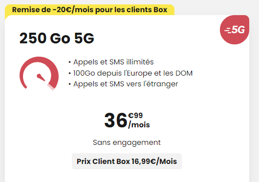 Du côté de l’opérateur au carré rouge, il est également possible de souscrire un forfait internet + mobile avec n’importe quelle box SFR. L’abonnement mobile inclut dans votre pack est est le forfait 250 Go en 5G sans engagement à 16,99€ par mois au lieu de 36,99€ par mois, soit une remise exceptionnelle de 20€ par mois pour les clients Box. En plus des 250 Go d’allocation internet en 5G, ce forfait comprend les appels et SMS illimités, 100 Go de données depuis l’Europe et les DOM ainsi que les appels et SMS depuis l’étranger.