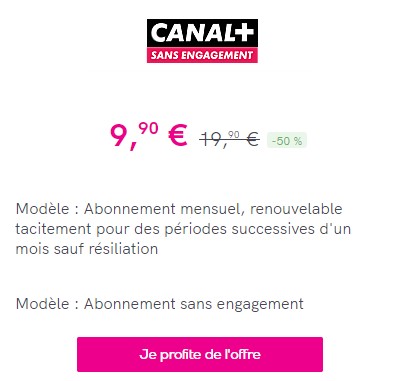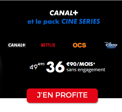En ce moment CANAL+ vous propose aussi une promo sur son offre sans engagement CANAL+ et le pack CINE SERIES. Cette offre inclut entres autres 10 chaînes CANAL+, les chaînes OCS, la chaîne Disney Cinéma et même un accès à NETFLIX ! Ce pack est proposé à seulement 36,90€/mois au lieux de 49,90€/mois, soit une réduction de 13€ par mois. L'avantage d'une offre comme celle-ci, sans engagement , est que vous pouvez la résilier dès que vous le souhaitez.