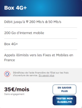 Cette BOX 4G+ est sans engagement de durée et la location de la box est incluse. Des frais de mise en service de 19 € sont toutefois appliqués.